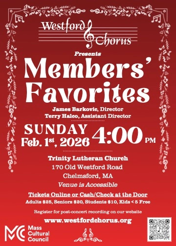 The Westford Chorus is a SATB community chorus. We strive to present the widest possible spectrum of choral music to Westford and the surrounding communities